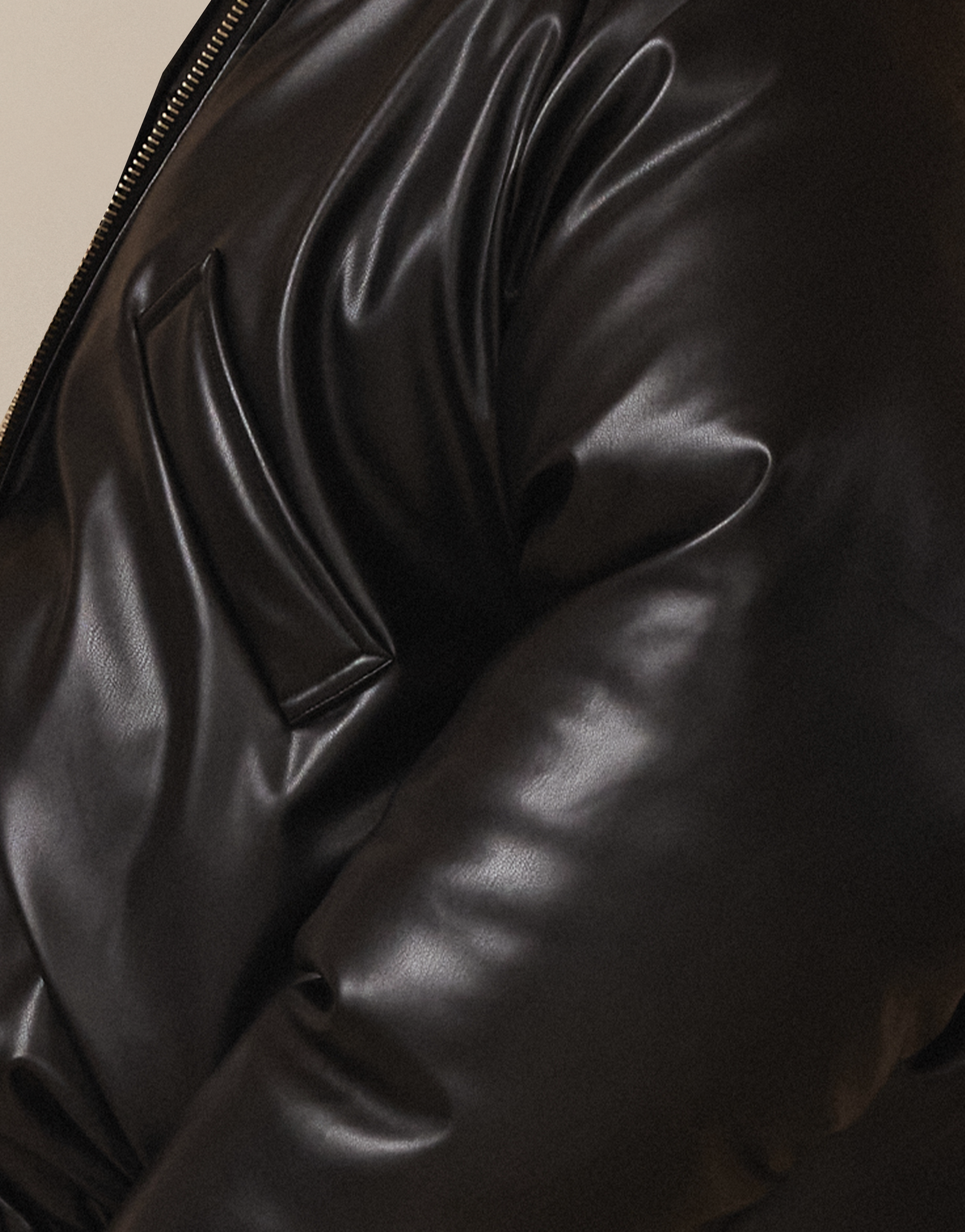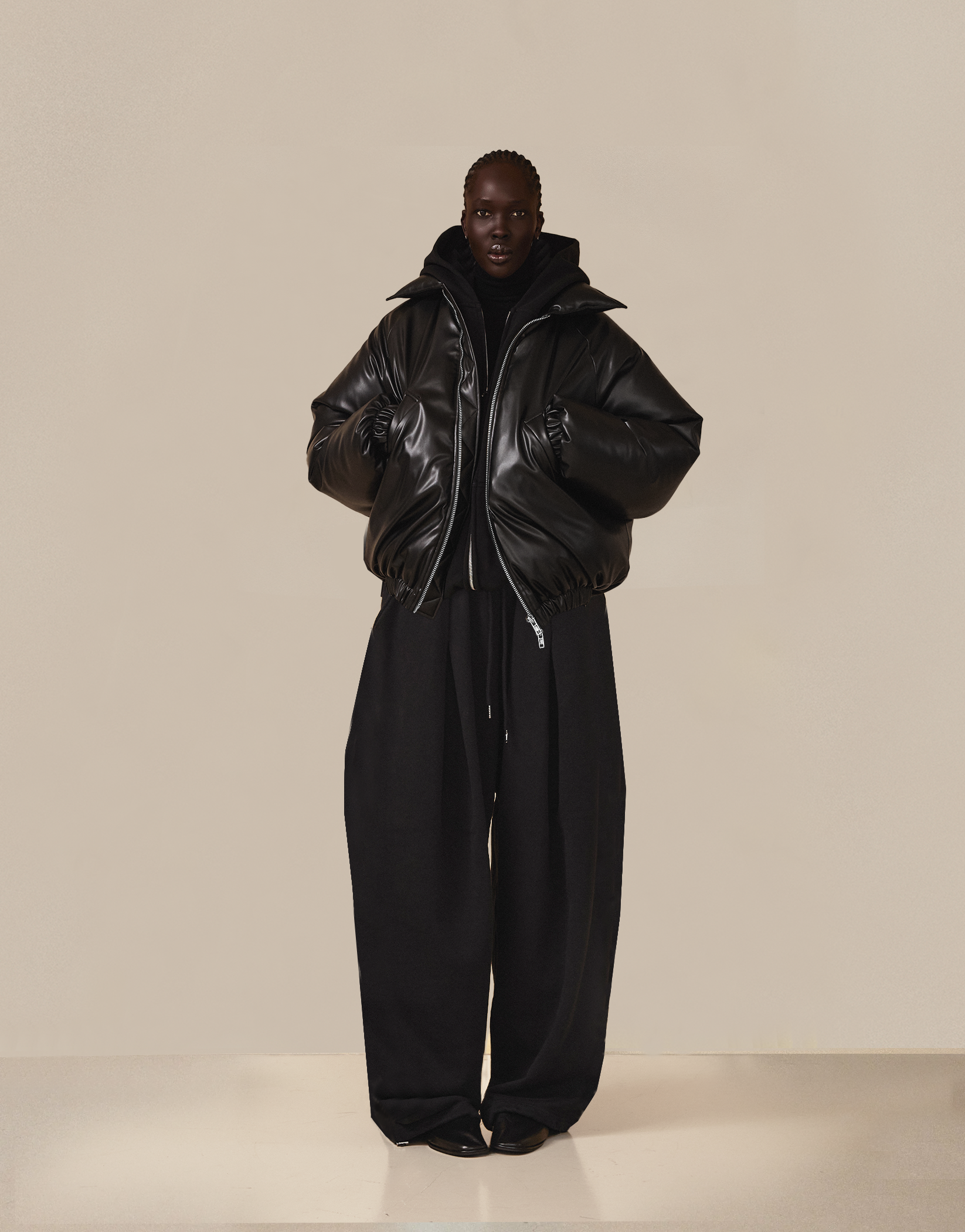 The deep black tone evokes sophistication and timeless allure, while the padded silhouette offers cocoon-like comfort that moves with intention. Ribbed details at the cuffs and hem lend subtle structure, and a sleek zip-front closure completes the piece with understated precision.