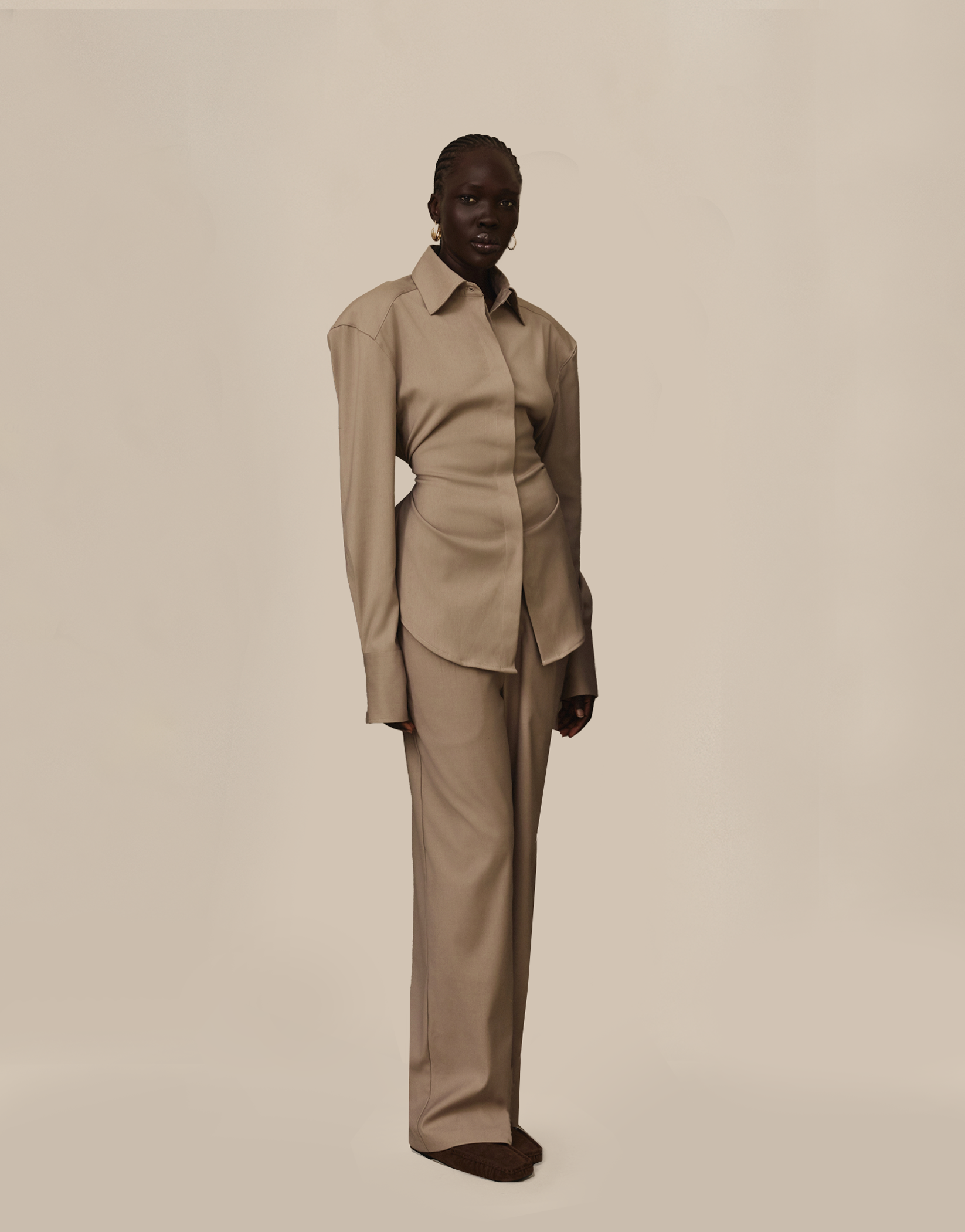 The Rue Pants in Chai Latte blend soft tailoring with fluid structure, designed to move with ease while maintaining an elegant silhouette. Cut from lightweight suiting fabric, they feature a gentle drape, mid-rise waist, and a slightly flared leg that flatters and elongates the form.
